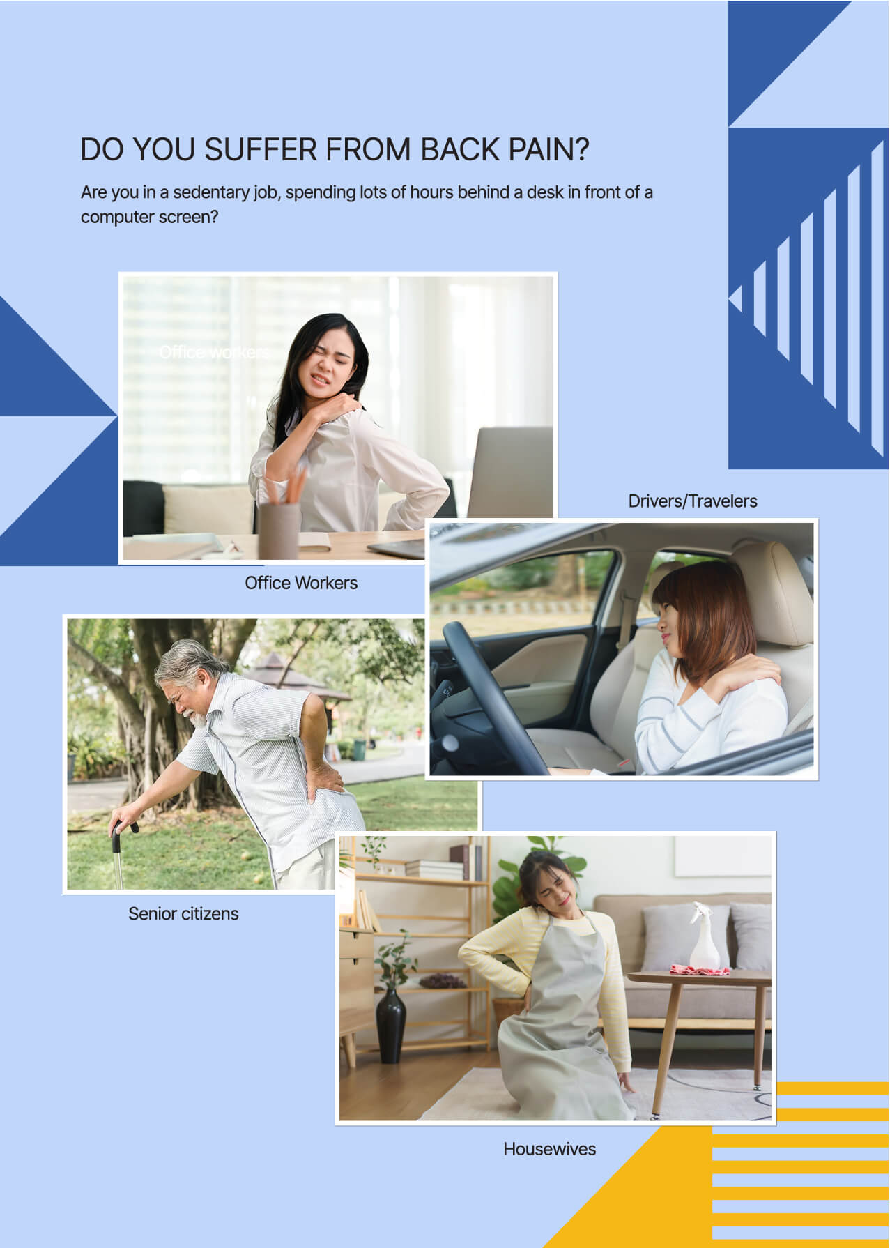 Office workers | Senior citizens | Drivers/Travelers | Housewives