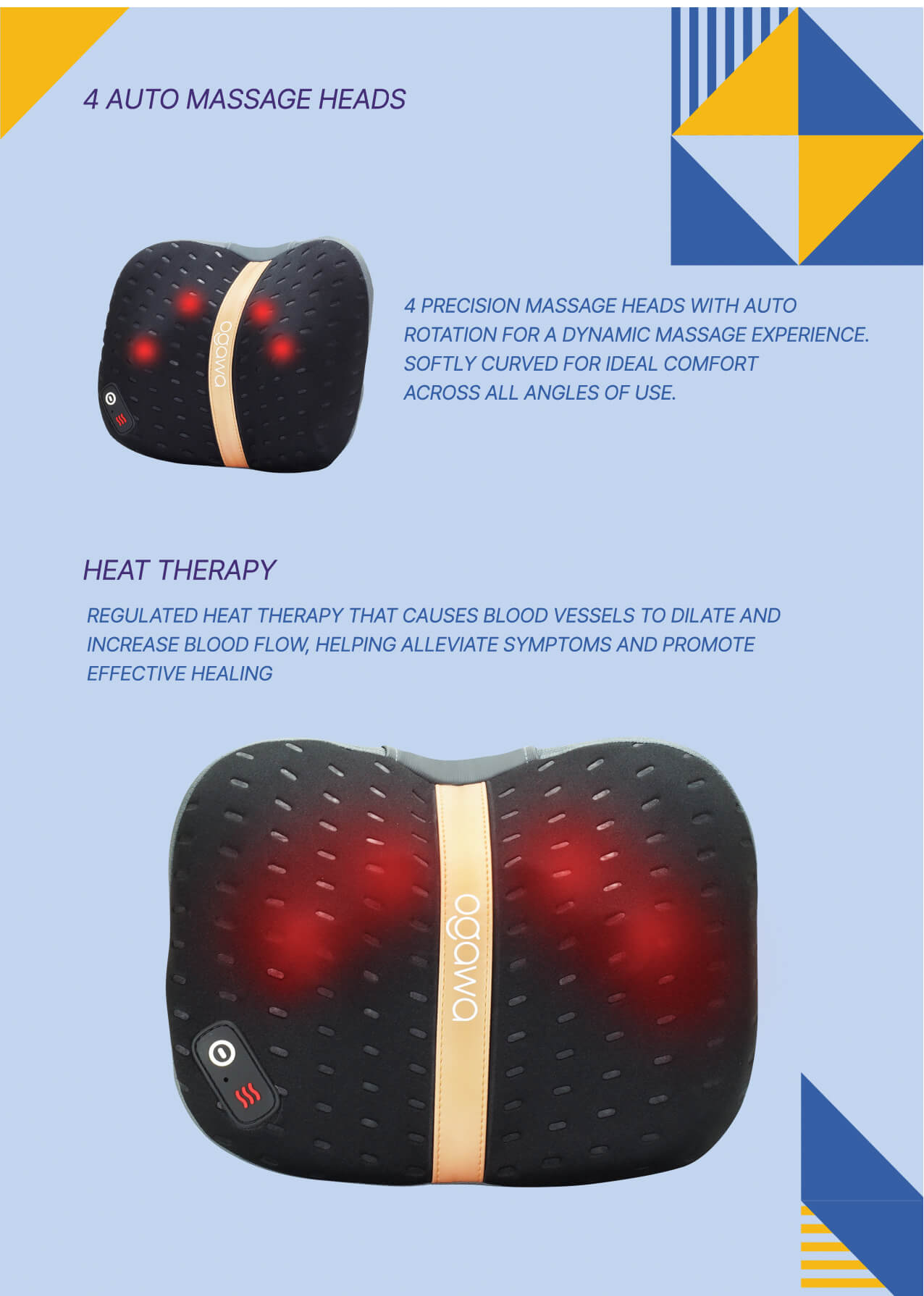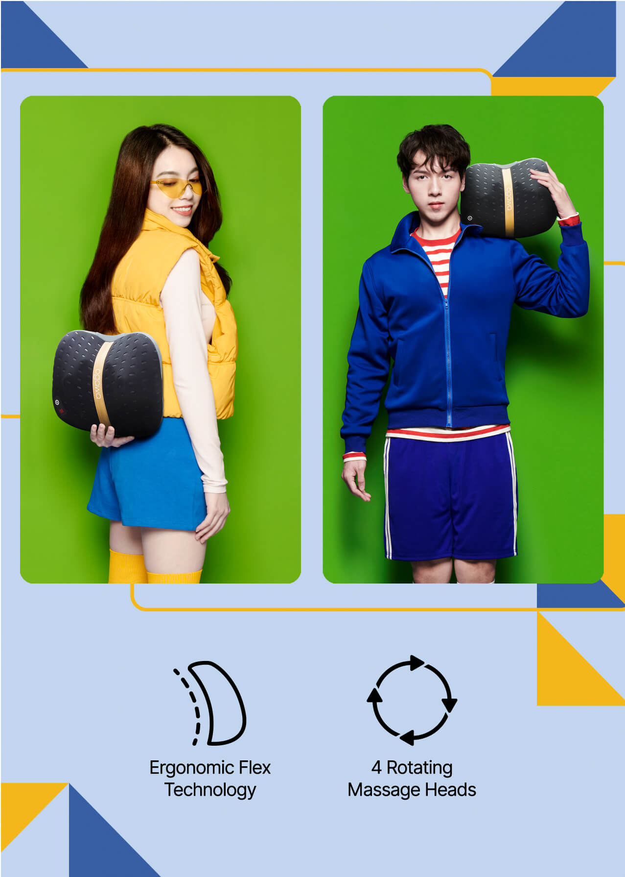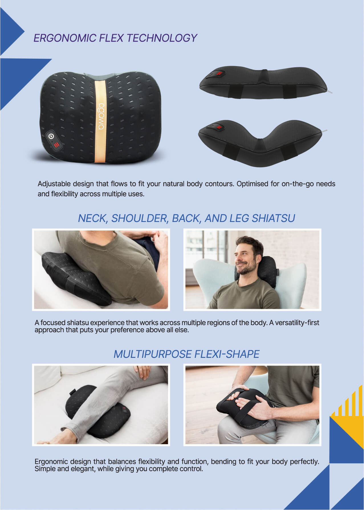 ▪ Ergonomic Flex Technology – adjustable design that fit your natural body contours – for neck, shoulder, waist & leg