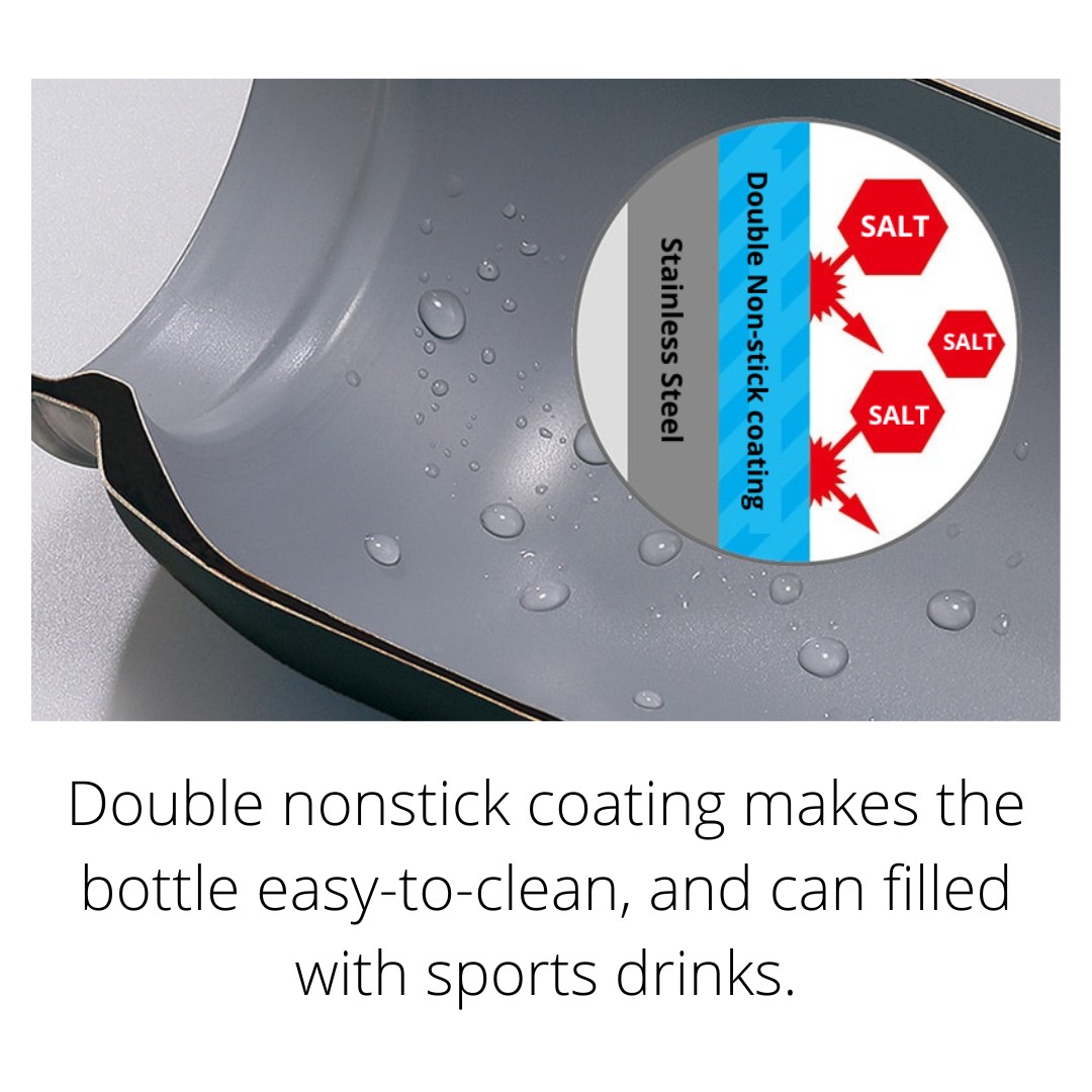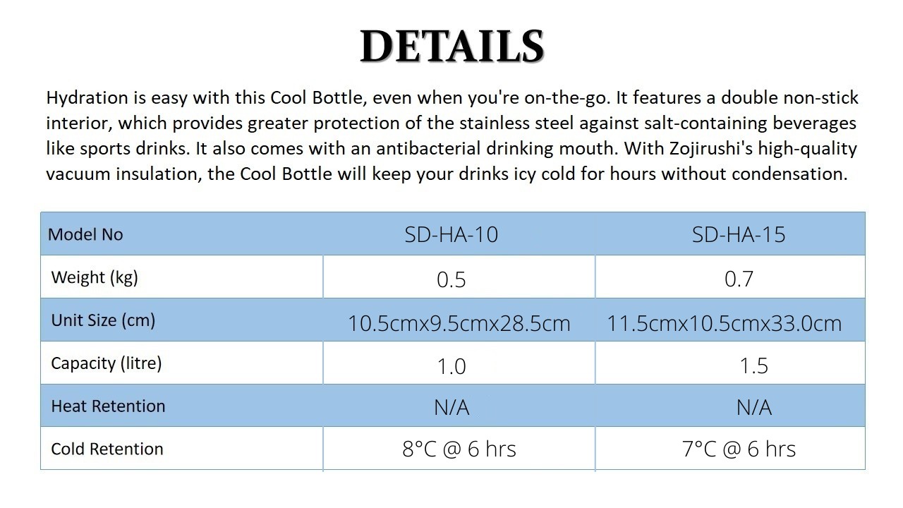 Hydration is easy with this Cool Bottle, even when you're onthe-go. It features a double non-stick interior, which provides greater protection of the stainless steel against salt-containing beverages like sports drinks. It also comes with an antibacterial drinking mouth. With Zojirushi's high-quality vacuum insulation, the Cool Bottle will keep your drinks icy cold for hours without condensation.